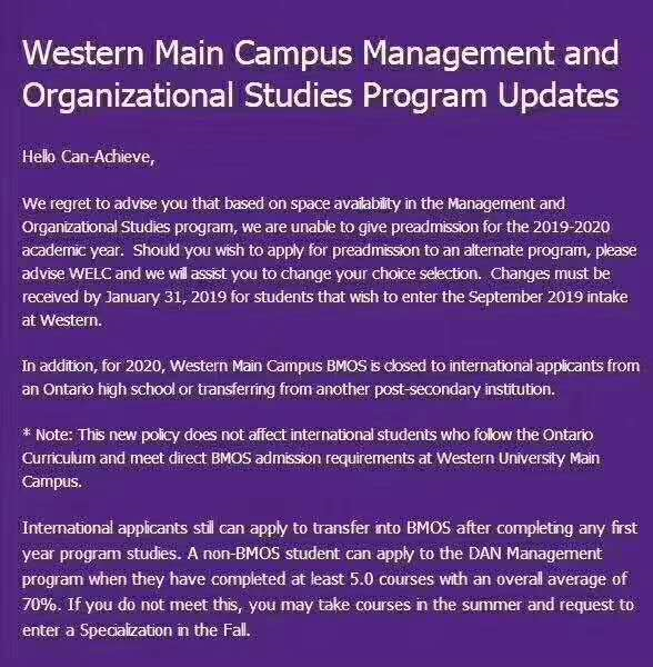 韦仕敦大学主校区BMOS专业将 不再接受 就读 安大略省高中课程 (Ontario Curriculum) 的 国际学生 申请该专业的 有条件录取 (Conitional Amission)。