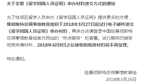 近期,驻曼彻斯特总领事馆教育组发布了“关于变更《留学回国人员证明》申办材料递交方式的通知”,英国曼城领区所属31所院校可以线上递交申请。