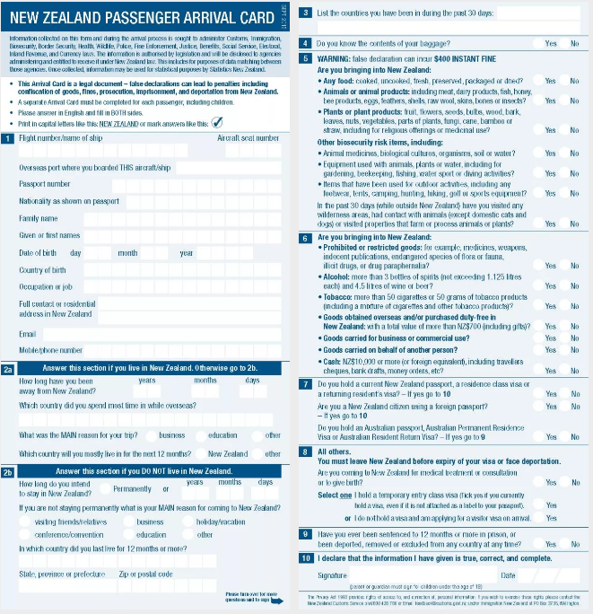 在抵达新西兰之前,你必须填写新西兰乘客入境卡。 这是一份非常重要的文件,你填写的信息必须真实且需要用英文填写。
