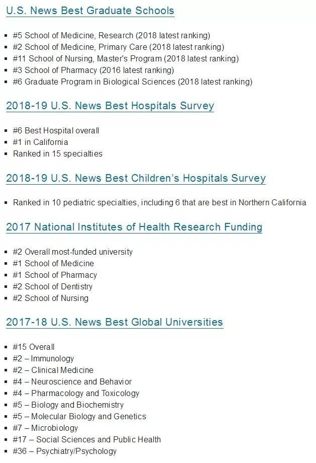 也由于其对生命健康医学的专注和重视,虽然在USNews综合大学排名上看不到UCSF的影子,但其研究生院学科排名情况还是非常可观的。