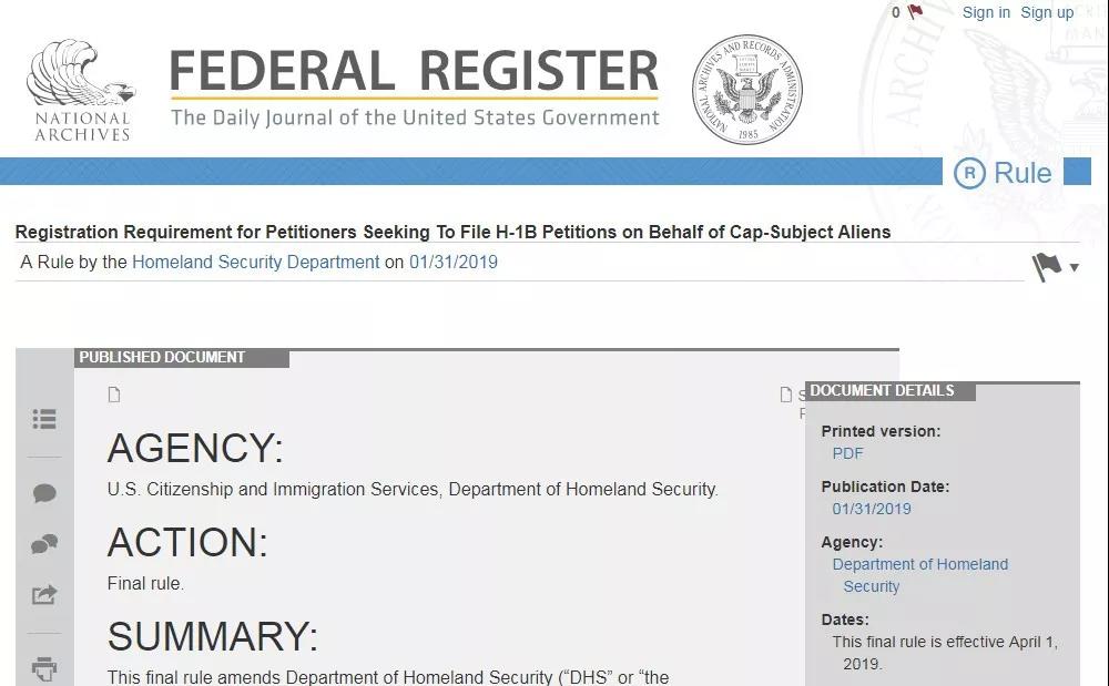 从2018年初,执行川普的“买美国货,雇美国人”行政指令,加强对H-1B签证彻底审查;发展到移民局严审外包公司,规定所有“涉及在第三方场所工作”的H-1B申请都加强审核,防止H-1B签证滥用;从2018年中旬宣布收紧H-1B;到年底提出完善抽签制度;政府停摆时川普还不忘在推特上邀功,要推出一个优化的H-1B签证的处理程序,鼓励人才留在美国追求职业发展。 终于,在2019年1月30号,美国国土安全部(DHS)宣布, H-1B最终改革方案将在Feeral Register公示60天,于4月1日生效。 这份改革提案于2018年11月30日提出,并于2018年12月3日至2019年1月2号进行了 Feeral Register 公示,收集民众反馈,现在版本就是最终版本。