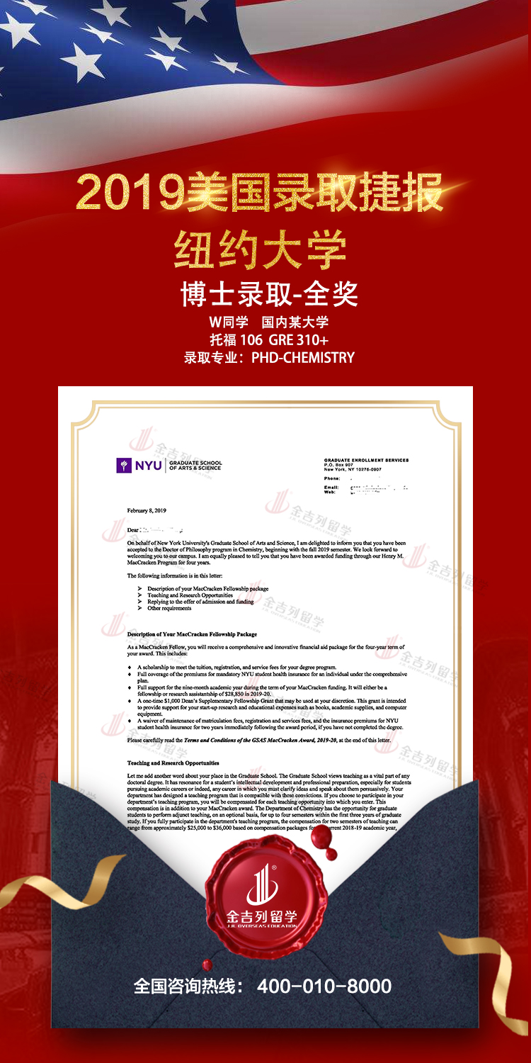 W同学,托福106, GRE310+, 录取专业 PHD-CHEMISTRY , 全额奖学金