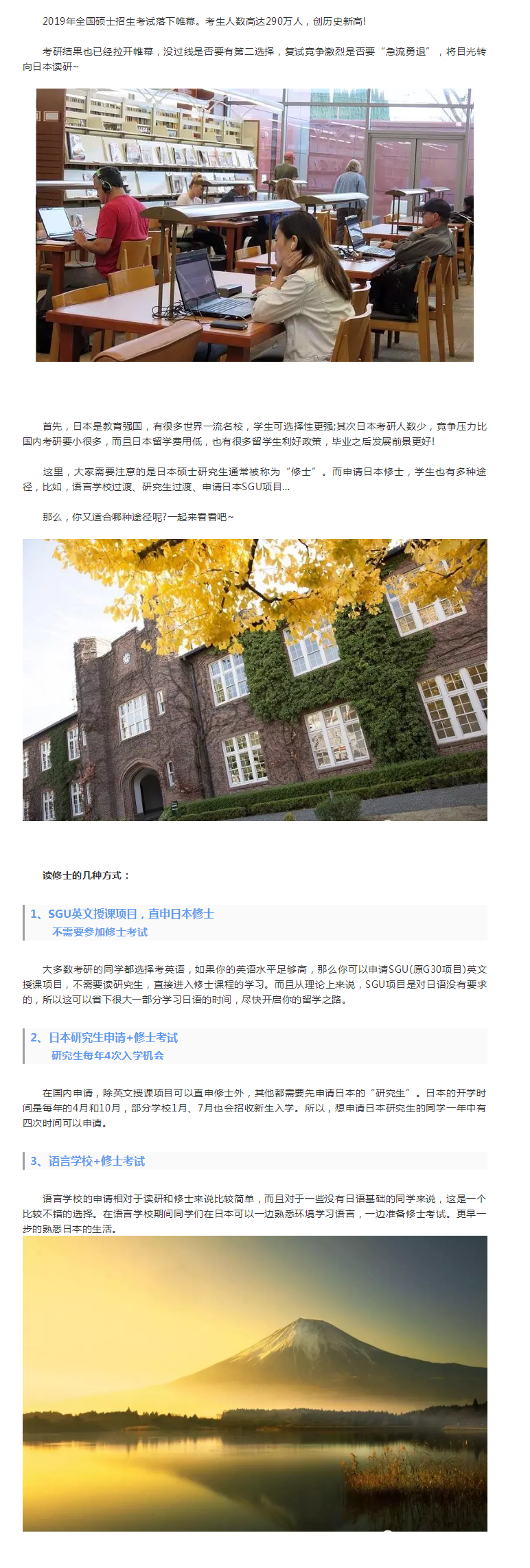 2019年全国硕士招生考试落下帷幕。考生人数高达290万人,创历史新高! 考研结果也已经拉开帷幕,没过线是否要有第二选择,复试竞争激烈是否要“急流勇退”,将目光转向日本读研~