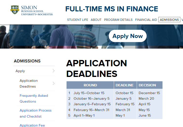 美国研究生商科申请截止日期一般有3-5轮,国际生建议申请前三轮,第一轮一般在11月1号,第二轮在12月1号或是1月1号,第三轮在3月15号,大部分学校的针对国际生的最后一轮。所以现在想要申请今年入学的同学,赶紧看过来!下面展示的是罗切斯特大学金融硕士申请的截止日期表。