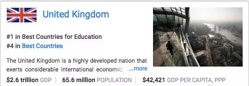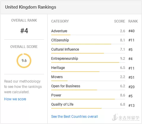 在 2018 US News 世界最佳国家综合排名中,英国位列第四,在不同的领域表现都很不错。