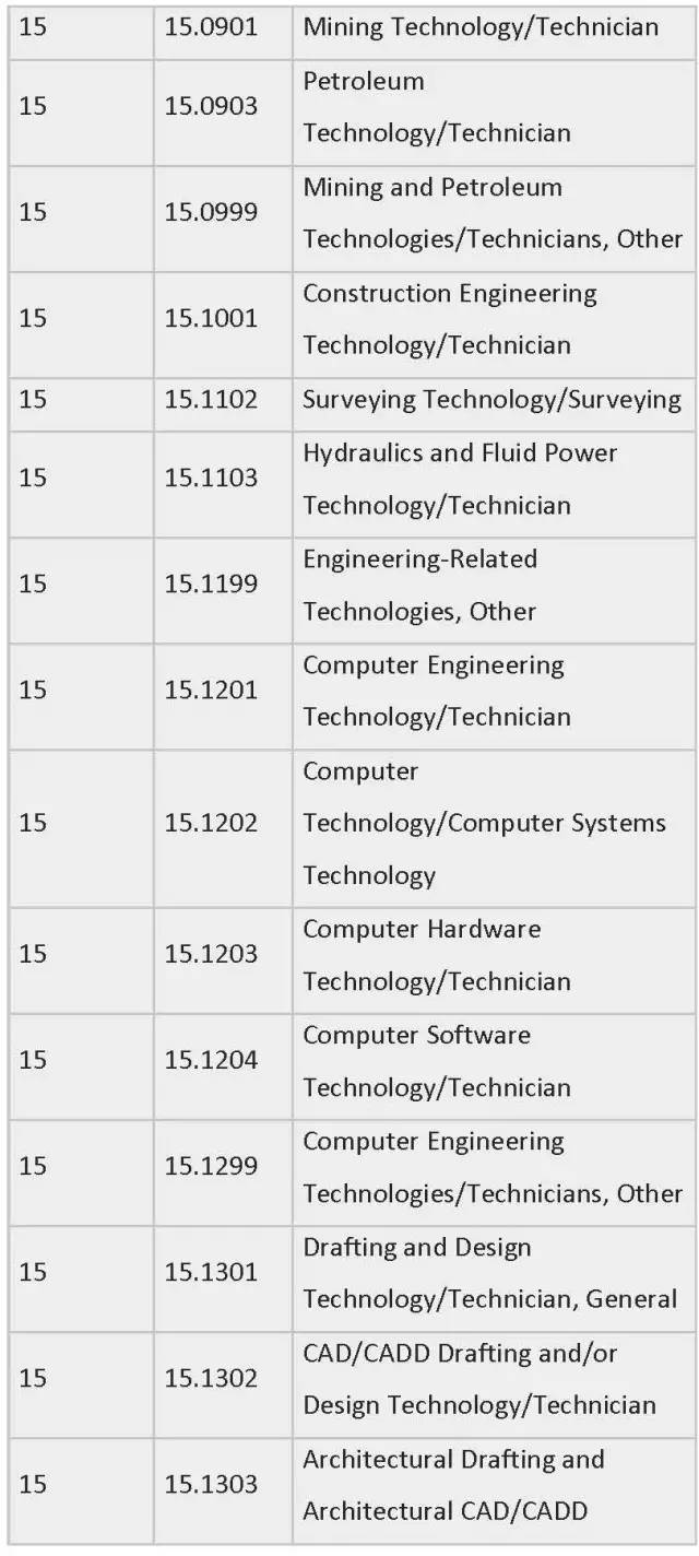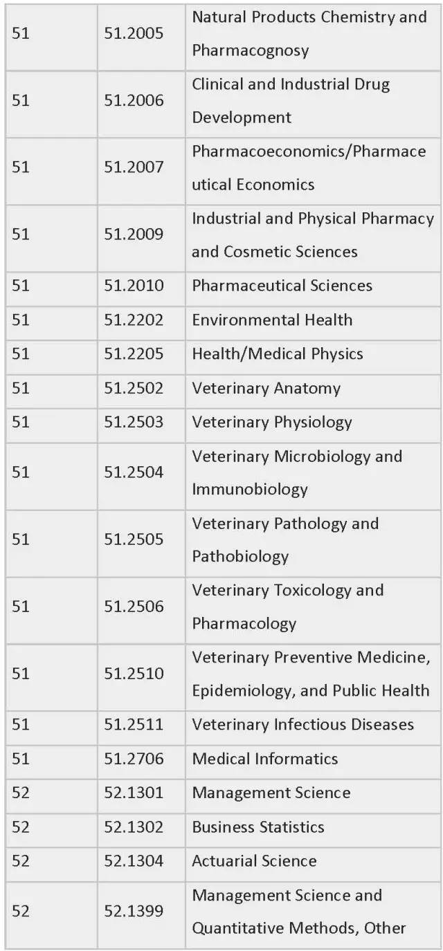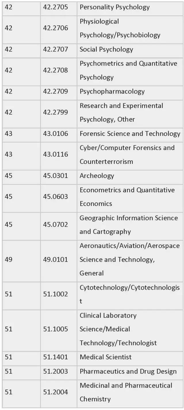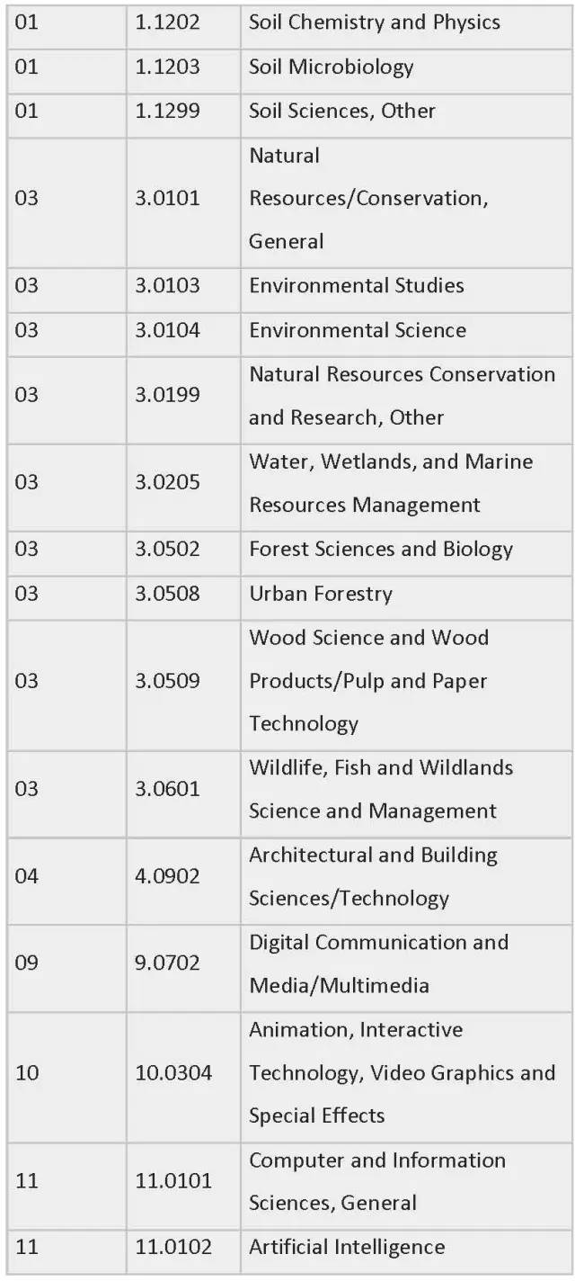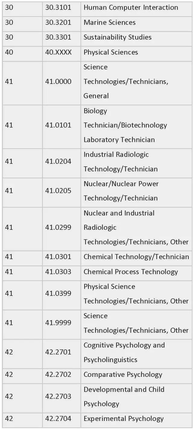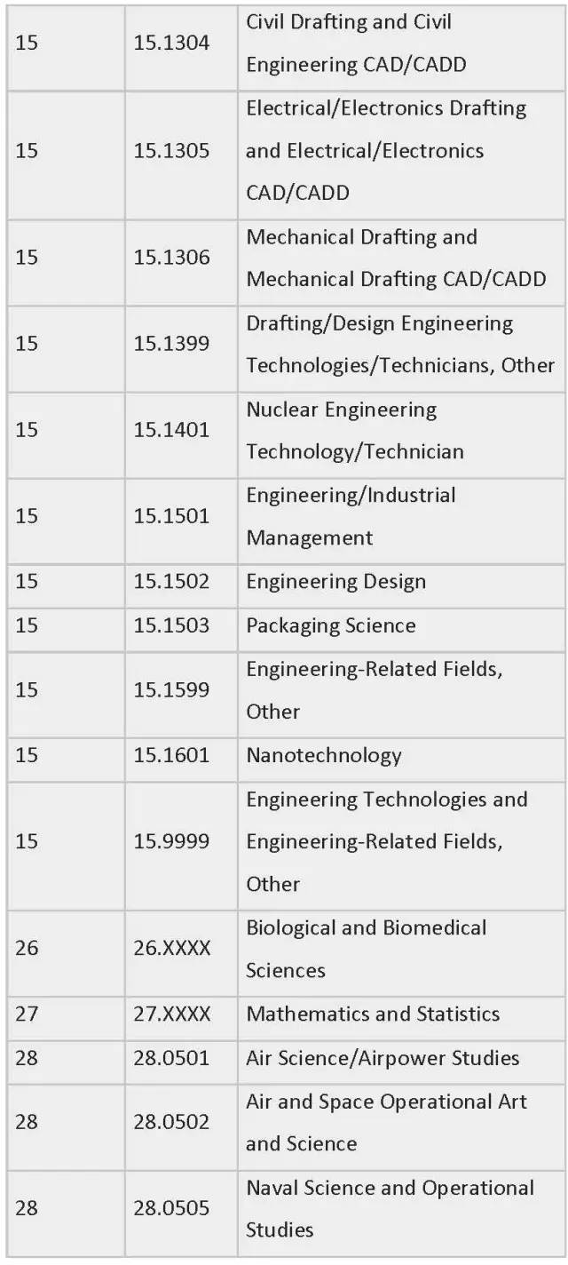 列表中为各专业按领域划分制定了相应编号,STEM专业四大领域的CIP Coe分别是:工程类 (CIP coe 14),生物科学类 (CIP coe 26),数学与统计学类(CIP coe 27),物理科学类 (CIP coe 40)。一旦有新的STEM专业出现,会被自动添加到此列表中。