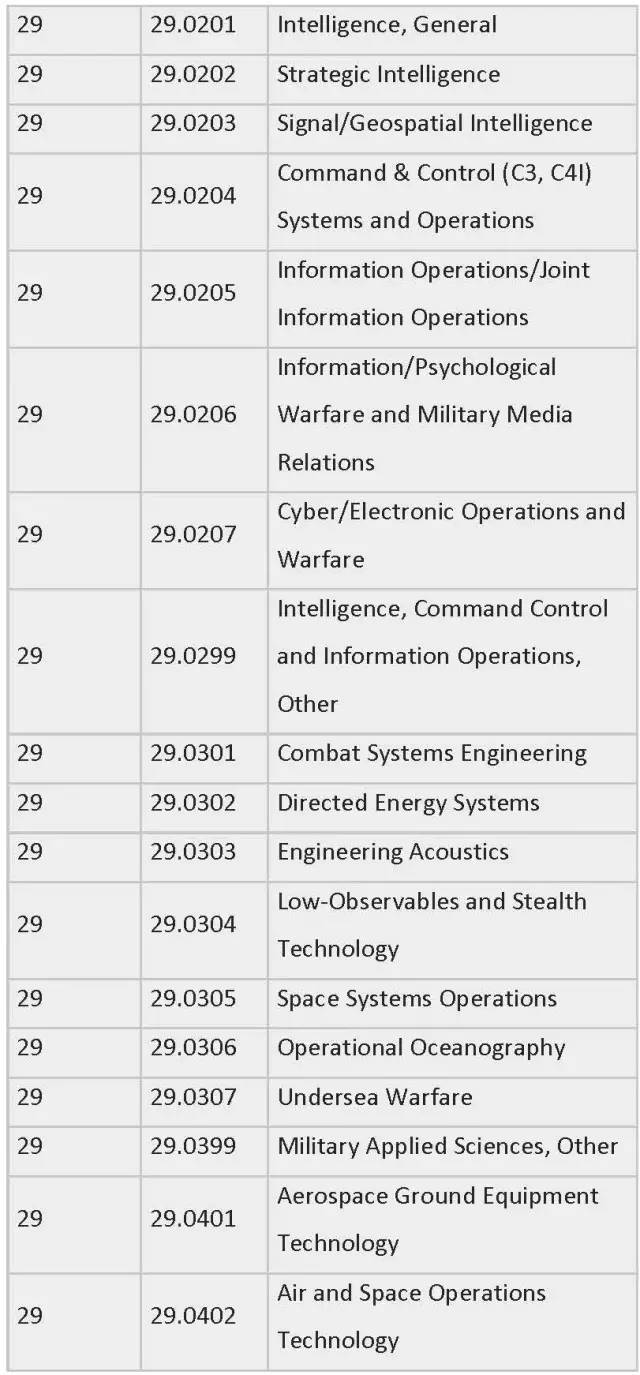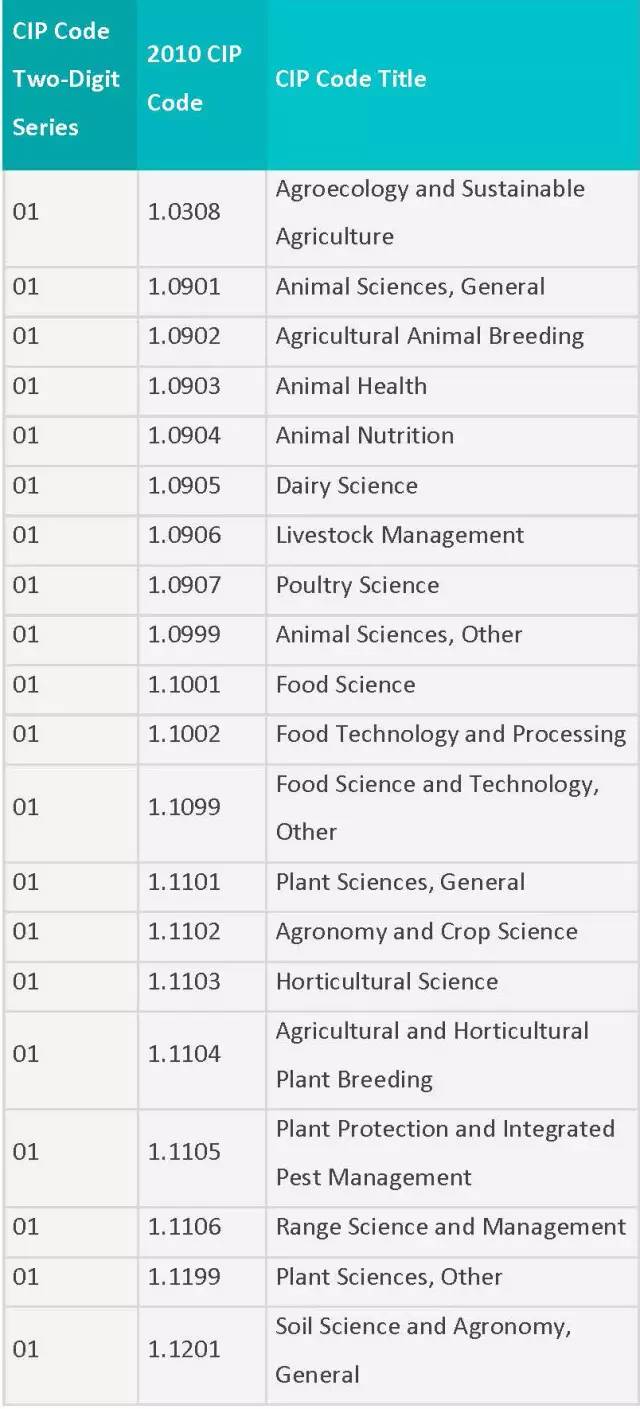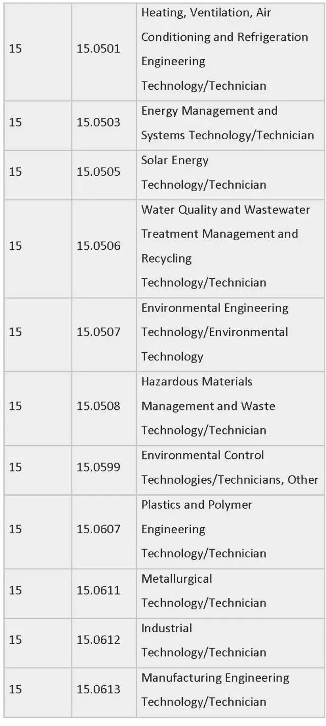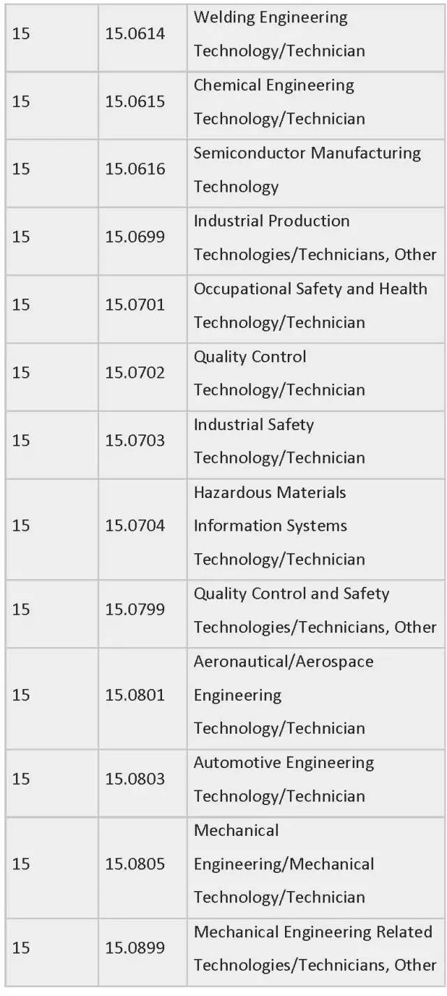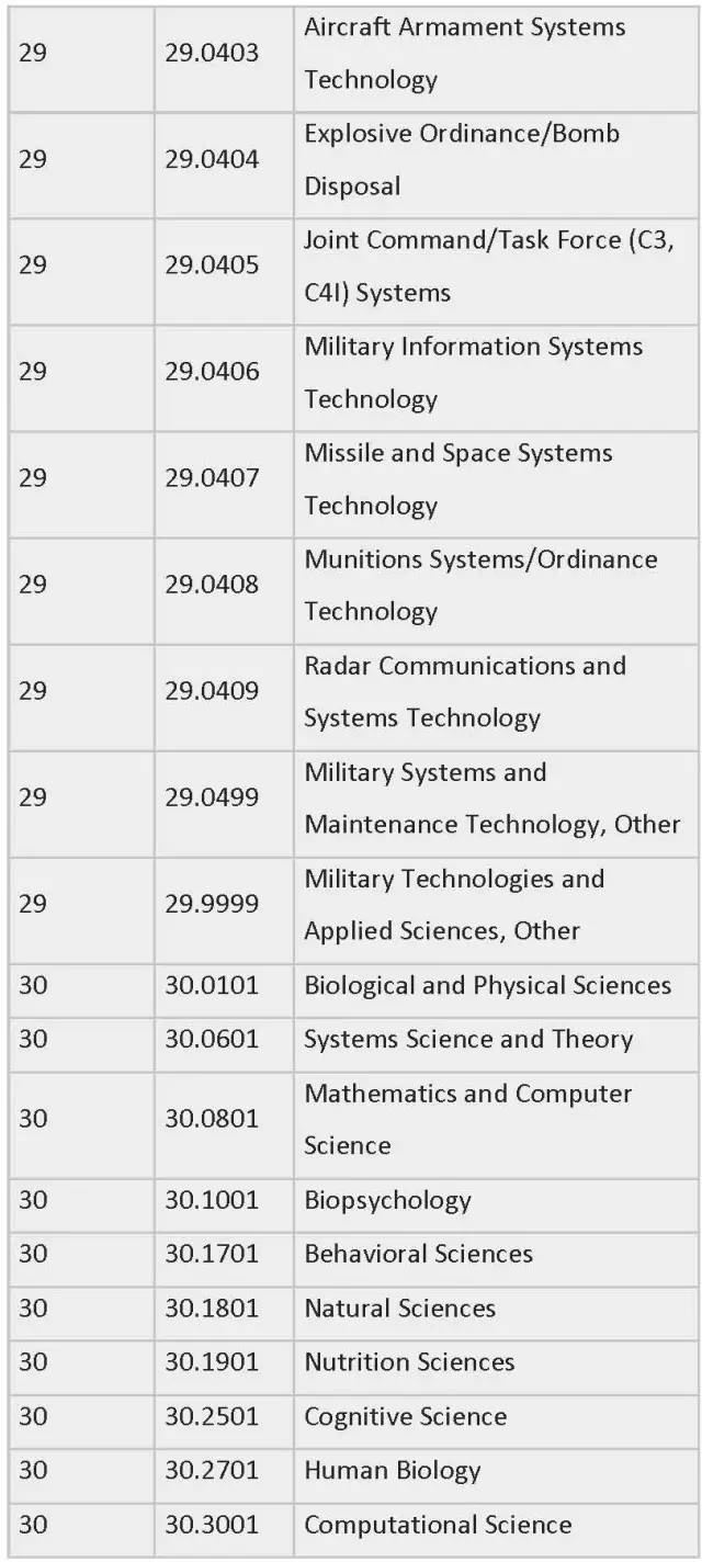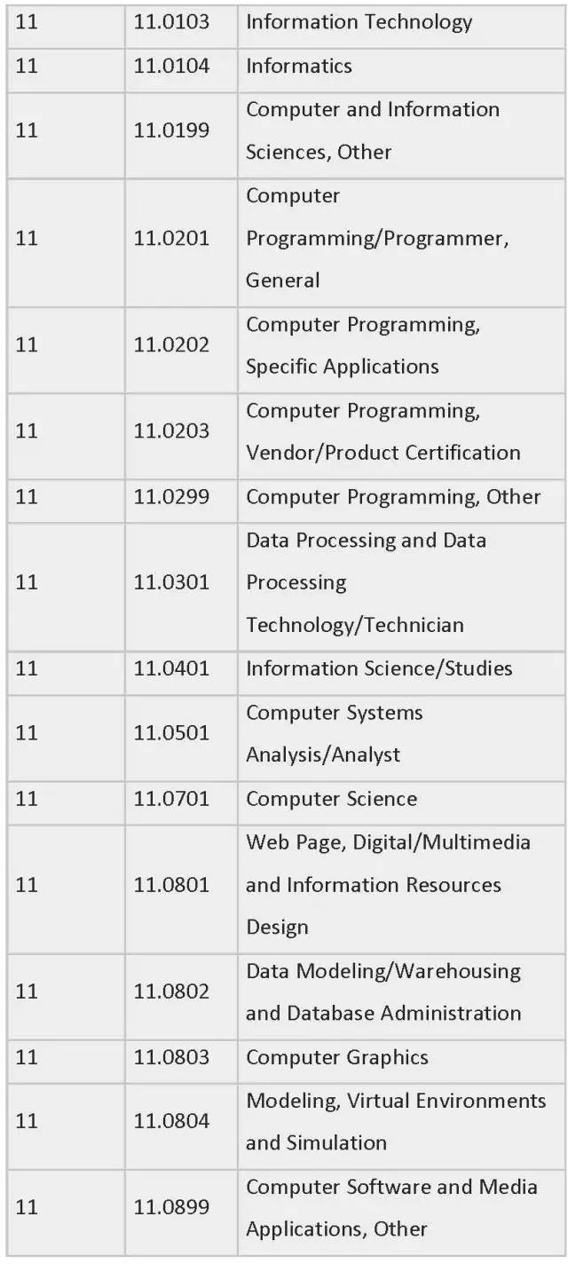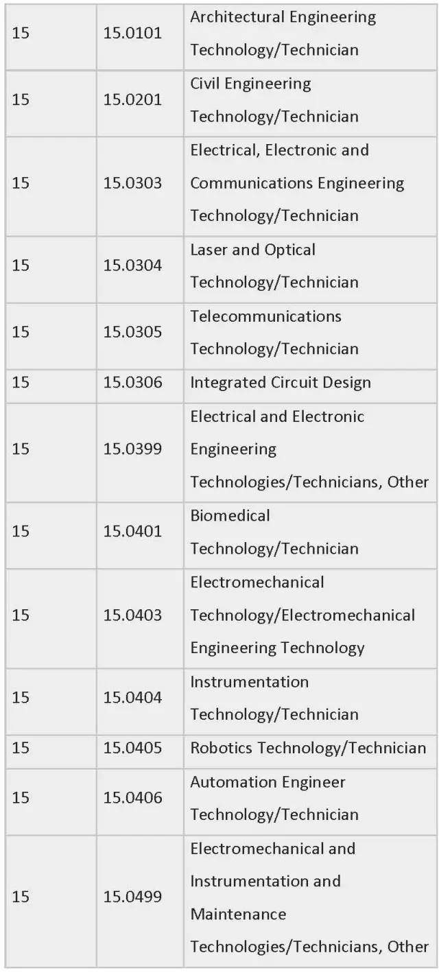 列表中为各专业按领域划分制定了相应编号,STEM专业四大领域的CIP Coe分别是:工程类 (CIP coe 14),生物科学类 (CIP coe 26),数学与统计学类(CIP coe 27),物理科学类 (CIP coe 40)。一旦有新的STEM专业出现,会被自动添加到此列表中。