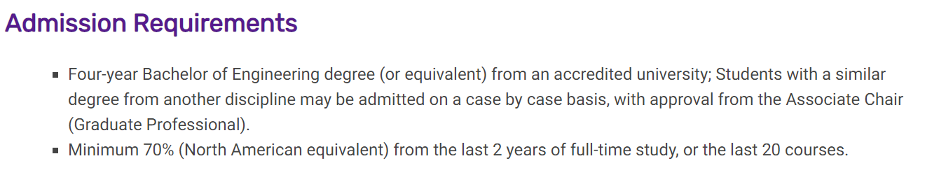 获得认可的大学四年制工程学士学位(或同等学历); 具有类似学位的其他学科的学生可以根据副教授(研究生专业人员)的批准逐案录取。