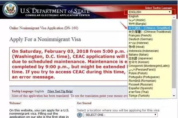 美国使馆签证处:当您在网上填写申请表(DS-160)时,将鼠标放在问题上,您会看到中文翻译,但请注意,您必须用英文回答问题。