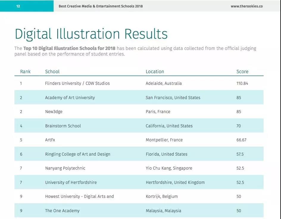 弗林德斯大学与CDW工作室(阿德莱德)合作建立的视效与娱乐设计学院(School of Visual Effects an Entertainment Design)于近日在与来自全球52个国家的近200所创意媒体院校进行激烈角逐之后,以领先第二名25分的绝对优势 再次被评为“The Rookies” 创艺媒体设计竞赛 - “全球最佳数字插画学院”第一名 。