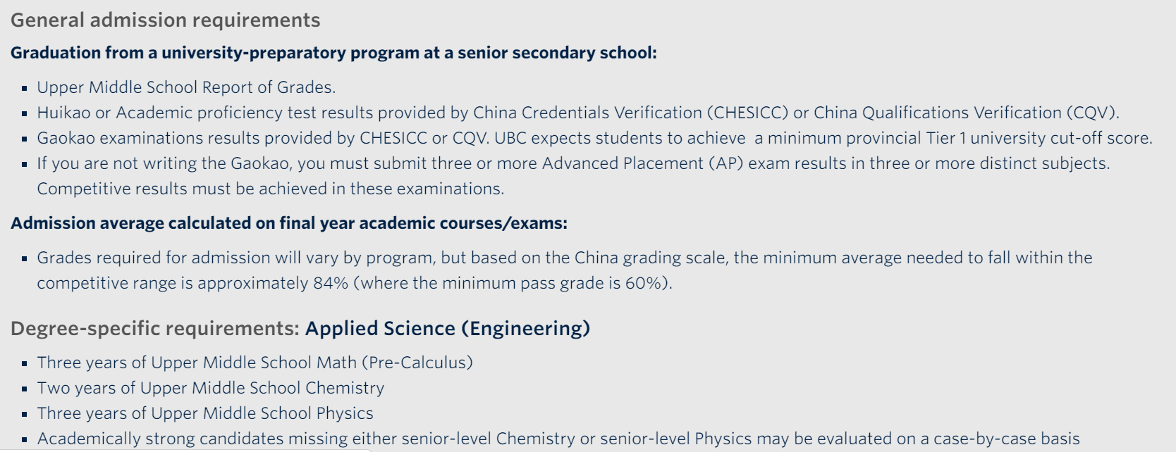 高考考试结果由CHESICC或CQV提供。UBC希望学生达到省级一级大学的最低分数。