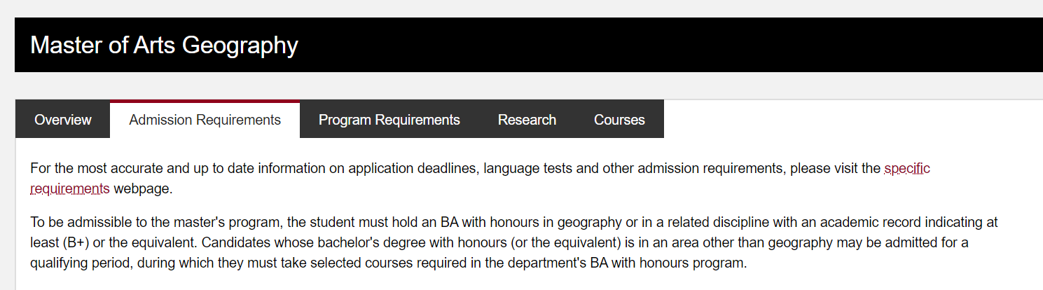 要获得硕士课程的录取,学生必须持有地理或相关学科的荣誉学士学位,并且学术成绩至少表明(B +)或同等学历。获得荣誉学士学位(或同等学历)的考生可以在合格期间入学,在此期间,他们必须参加该部门荣誉学士学位课程所需的选修课程。