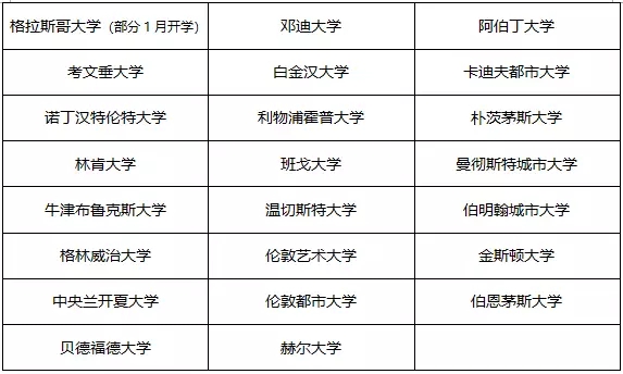 并非所有英国大学都开设春季入学,需要学生申请前自己查询院校是否开设春季入学。有些院校有专门的汇总入口,如果没有专门的汇总页面,可在筛选课程的start ate选项中选择春季入学月份。下为大家汇总的2019年开设春季入学的英国大学: