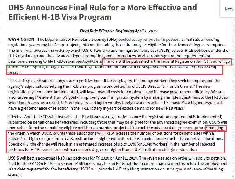 一句话总结:H-1B配额选择程序的改变。据估算,改革方案实施后,中签者中,拥有硕士及以上学位的人数比将增长16%,约多增加5340人中签。