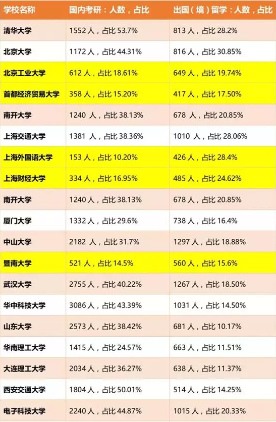 近些年选择出国的学生越来越多,在整个本科生群体中占据了一定比例。部分学校的出国(境)留学比例甚至超过了国内考研比例:首都经济贸易大学、北京工业大学、上海外国语大学、上海财经大学和暨南大学。