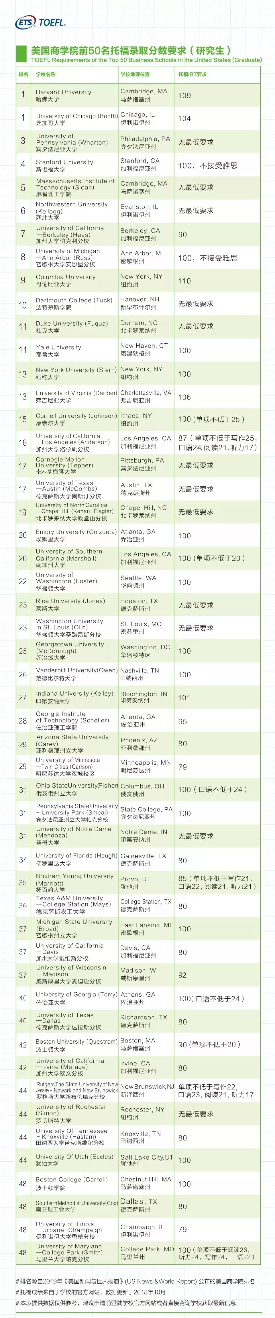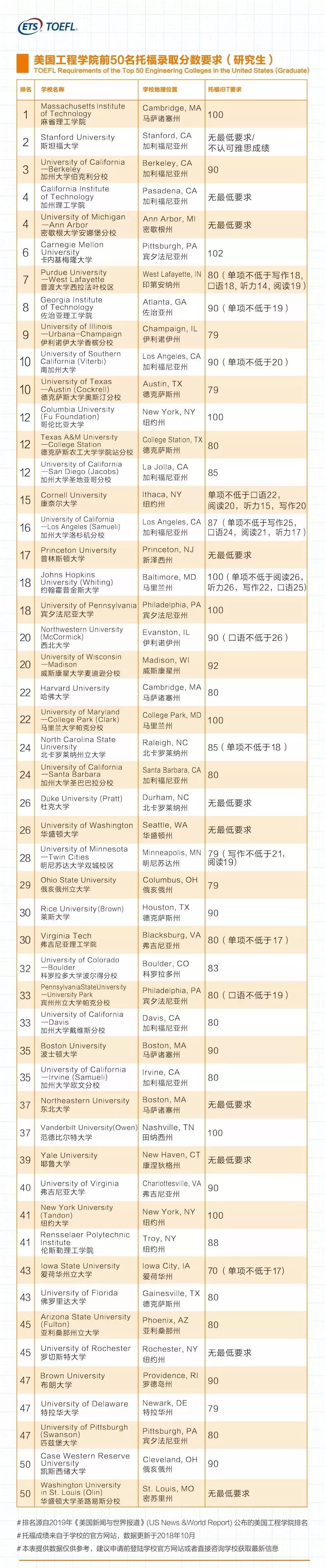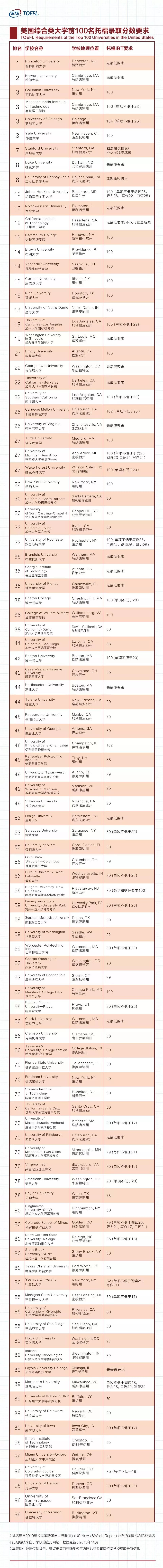 近日,ETS官方整理的美国综合大学TOP100、商学院和工程学院TOP50(研究生)的托福录取分数要求,在这里分享给大家,希望大家早日确立目标,做好备考计划,考取理想的成绩。