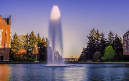 华盛顿大学坐落于华盛顿州西雅图市,700英亩大的校园位于美丽的华盛顿湖及联合湖边,有山有水,再加上校园内美丽的松树、樱花及古典雅致的建筑,华大的校园是全美公认很有诗意的。西雅图是美国西海岸北部最大的城市,是美国距远东最近的大型港口,著名的波音公司和微软公司皆位于西雅图市郊。这里是微软、波音、星巴克以及很多著名的摇滚乐队的诞生地。华大有 3 个校园,不过主校区仍位于西雅图市。