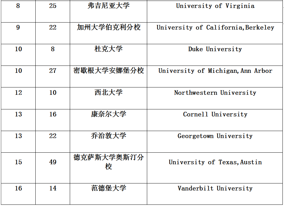 不过第8到第14,则变化很大,除了前面提到的7所大学之外,得克萨斯州大学奥斯汀分校也多次闯入十四强,包括加州大学洛杉矶分校、范德堡大学、圣路易斯华盛顿大学、爱茉莉大学、南加州大学都堪称世界级顶级名校!