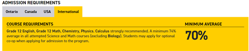 12年级英语 , 12年级数学 , 化学 , 物理 成绩 。所有科学和数学课程(不包括 生物学 )的GPA至少达到74%。申请入学时,学生可申请实习。