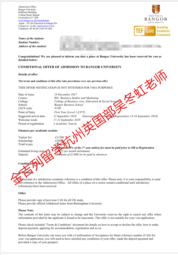 学生背景:伯明翰大学大一,会计金融专业,挂科三门,成功被班戈大学录取并拿到奖学金