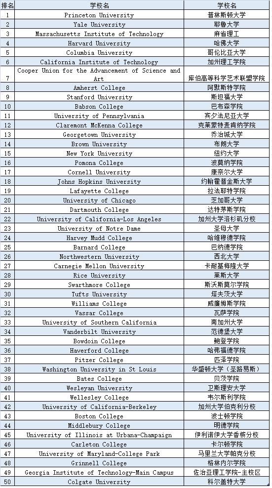 以下为《福布斯》最适合留学生的50所美国高校全名单:
