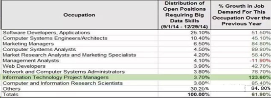 美国人才招聘市场的数据分析领先者WANTED Analytics 最近给出报告:2014年计算机系统分析师和大数据专业人才的市场需求分别增加了89.9% 、85.4%; Python 编程技能的市场需求增加了 96.9% 。