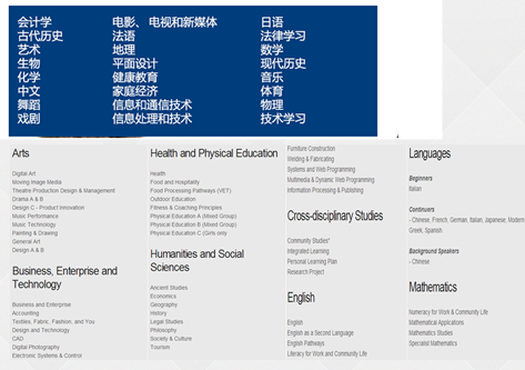 首先,我们来看看课程方面。众所周知,国内高中课程设置为语数外政史地生物化,其他课程比如美术、音乐、体育、计算机也随着年级增长间歇性开设。重点培养的是学生的学科考试能力。而澳大利亚的高中课程设置,我们来看一张图片: