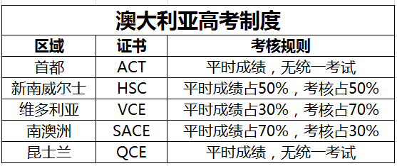 最后,我们来看看考核制度。国内统一的划分标准:高考。在澳大利亚却各区域标准各有不同,一张图表即可显示: