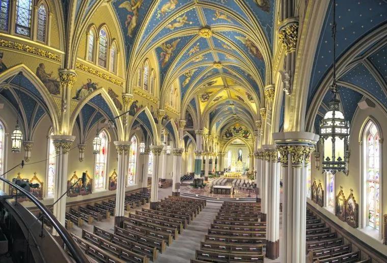 主要行政大楼顶部的Golen Dome已成为圣母大学最知名的标志之一。在火灾后重建,圆顶顶部有一尊19英尺镀金的圣母玛利亚雕像,象征着大学的天主教背景。 其他建筑地标包括圣心大教堂,其中拥有世界上最大的19世纪法国彩色玻璃。