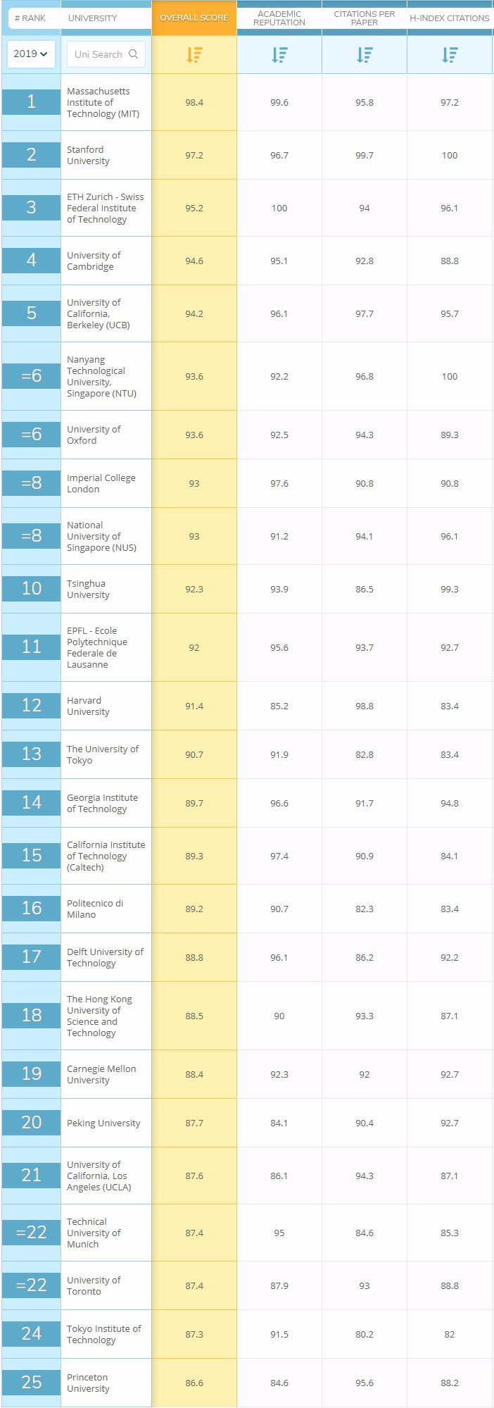 备受关注的工程类,MIT虽然没有拿到满分的指标,但胜在各个指标均衡发展,理所当然的稳居第一,其次是斯坦福,这两位是名副其实的工程大佬。
