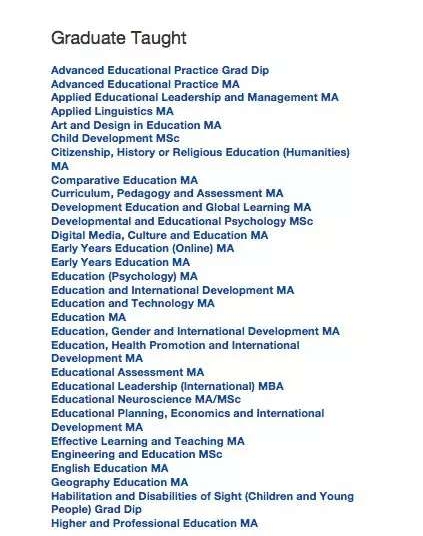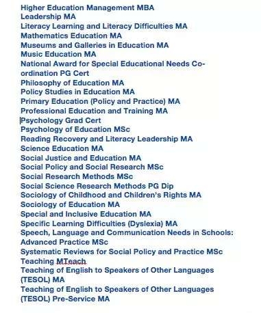 如连续五年世界教育学第一的IoE(Institute of Eucation University College Lonon)的授课型教育学硕士专业就有58个之多: