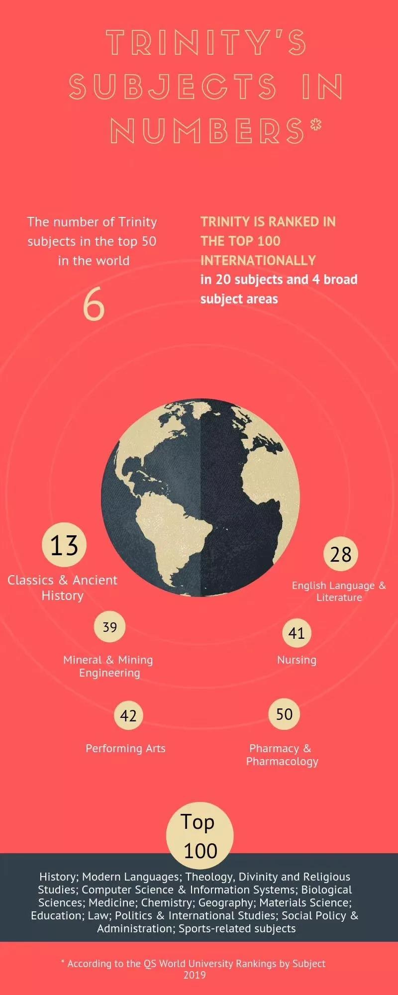 众所周知,2019QS世界大学学科排名是QS最大规模的排名研究成果,比起去年QS大学排行榜,科目榜单可以更直观地看到所选专业在全球的排名,对于更在意专业度和学科教学质量的同学有很大的参考意义。 此次排名包含了78个地方的1200多所大学,横跨5个领域和48个细分学科, 意味着2019年圣三一又有将近50%的学科名列世界前茅。 此次排名有四项指标:学术声誉、雇主声誉、论文引用数量以及H指数,其中学术声誉这一项评分占比最高,充分体现了 圣三一研究人员在全球范围内的高度声誉以及学科的研究实力。 可以说, 跻身世界百强绝非易事 。在爱尔兰教育事业面临着越来越大的压力之际,圣三一20门不同学科跻身世界前100,这无疑是我们 优秀的教学人员和学生的一个强有力背书 。这也说明了学校的研究优势的广度和多样性。