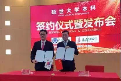 韩国延世大学入学处副处长金·迈克尔(左一)与金吉列留学常务副总裁郑应文(右一)完成协议签署