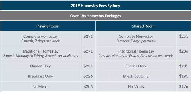 以下是AHN(Australian Homestay Network)发布的官方价格表,根据是否带餐,周租金价格略有不同: