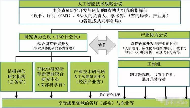 该组织的指挥部协同总务省、文部科学省、经济产业省所辖的 5个国立研究开发法人,在推进人工智能技术研发的同时,加强同主管利用AI产业的政府机构的协力,以推广AI技术的应用。这个机能通过在 “人工智能技术战略会议” 下设 “研究协力会议” 与 “产业协力会议” 而得到保证。以此为中心,产业界同步跟进相应的措施,推进人工智能的研发与应用。