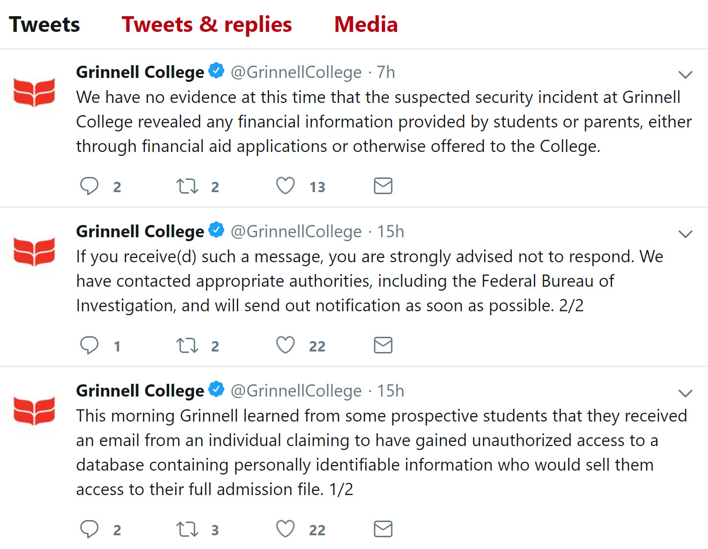 Grinnell在周四的twitter中表示:“他们已经知道一些perspective stuents收到了诈骗邮件甚至offer,但请各位不要回相关邮件。校方已联系FBI介入。”