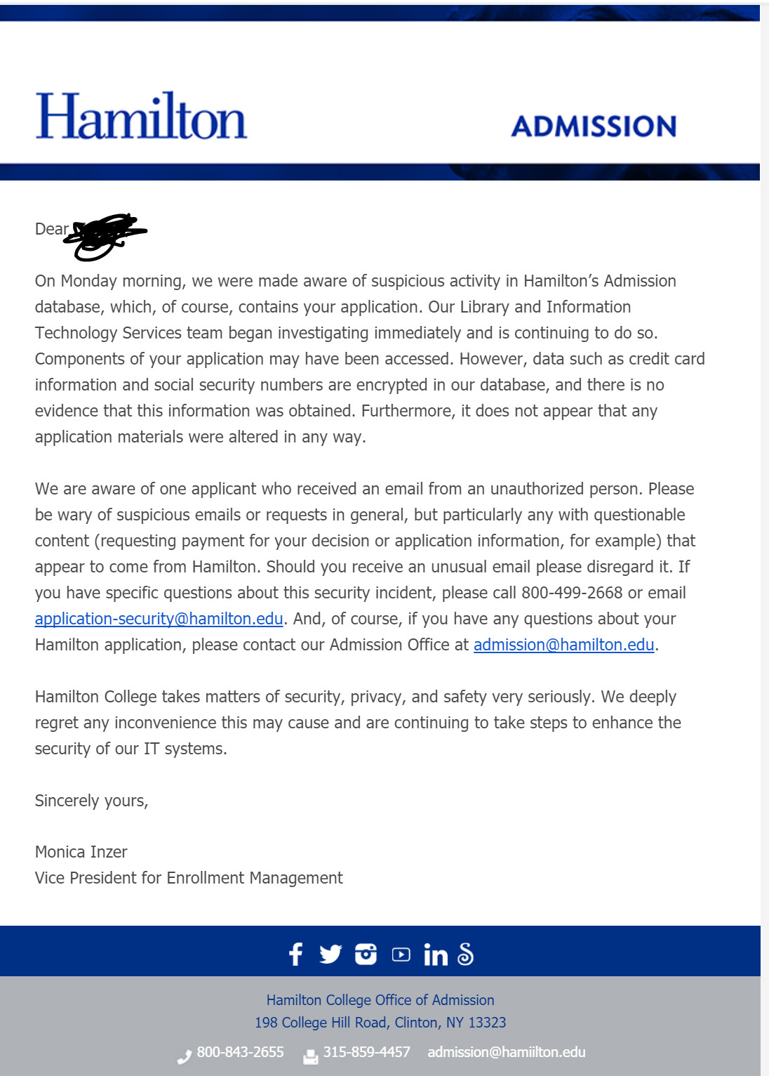 Michael J. Debraggio, Hamilton的传播部副总监助理也向The Chronicle汇报道:“学校已确认了有不少申请者收到了交易邮件。学校已经介入调查并通知所有申请者‘可能的信息泄露’。”
