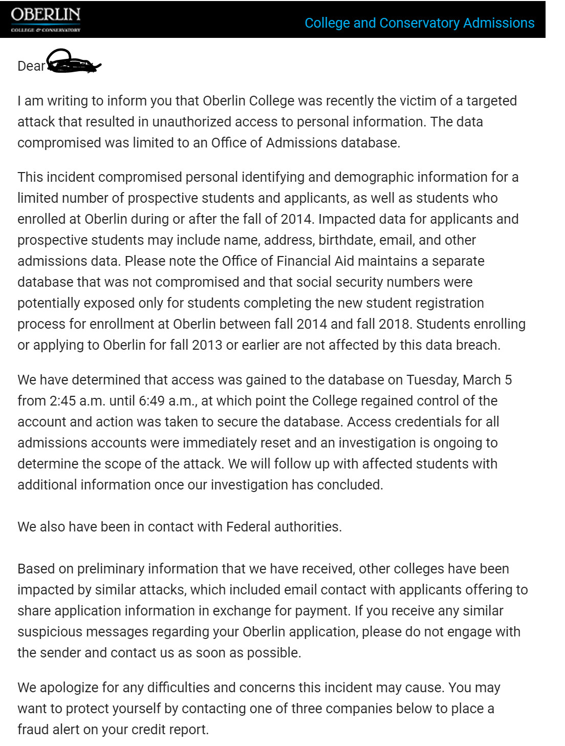 Oberlin相对来说情况稍好, 官方在美东时间3月5日,上午2:45到上午6:49发现了非法入侵,但暂时没有人收到诈骗邮件。官方已确认Oberlin是本次信息泄露的受害者之一,可能泄露的信息有:申请者姓名,地址,生日,邮箱和其它评估数据。