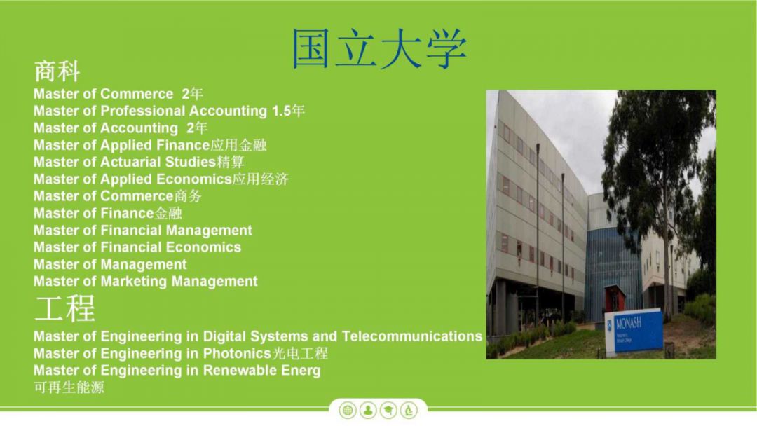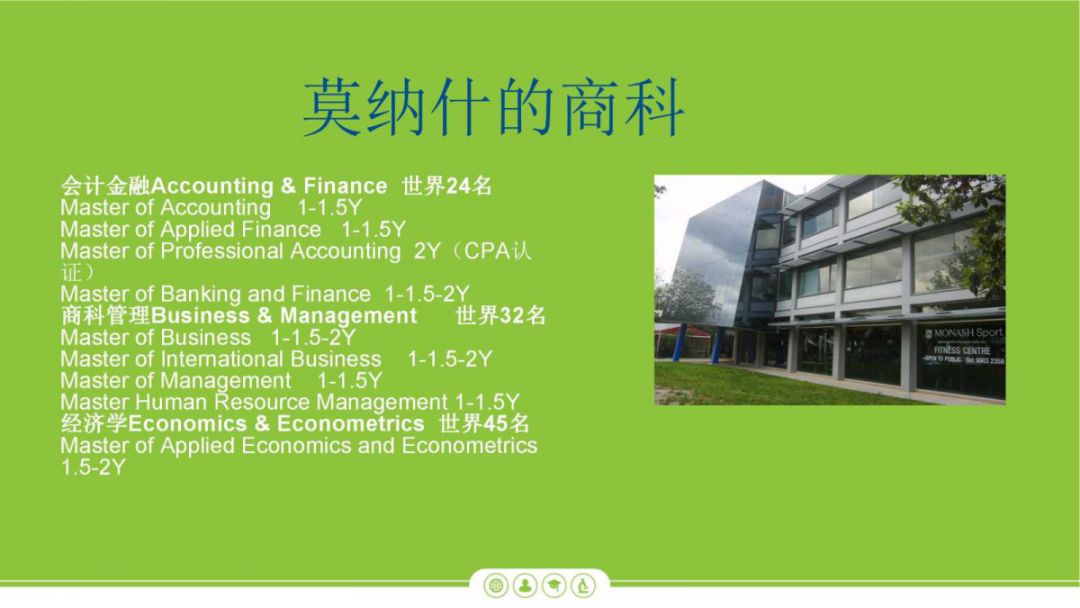 首先是莫纳什大学,莫纳什的商科非常热门,其中包括会计学、应用金融、商科管理、经济学等专业,这些专业在世界专业排名也是比较高的。学制一般有1年制、1.5年制、2年制。