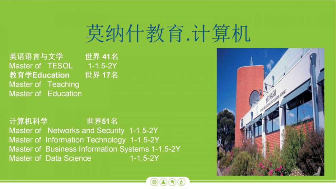 莫纳什的教育和计算机专业中的英语语言文学专业世界排名41名,学生在国内本科专业是英语可以考虑一下这个专业。教育学世界排名17。IT是可以移民的专业,并且计算机科学专业不要求专业背景,想在澳洲移民的同学可以考虑一下。
