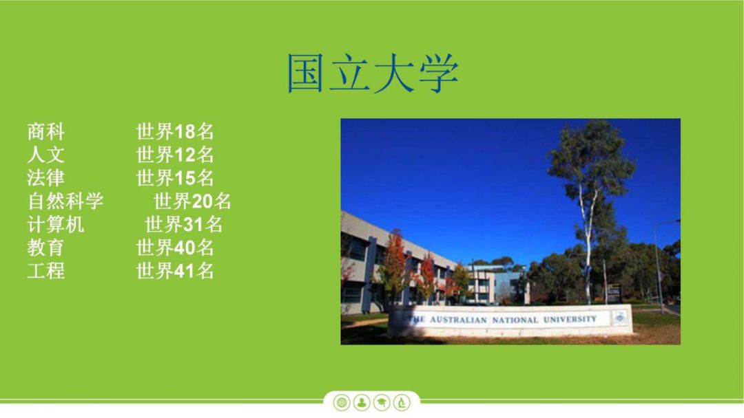 接下来我们说一下澳洲国立大学,澳洲国立大学是澳洲排名第一的大学,基本上学校所有的学科都排在世界前40左右,商科人文法律等更是排在世界前20。