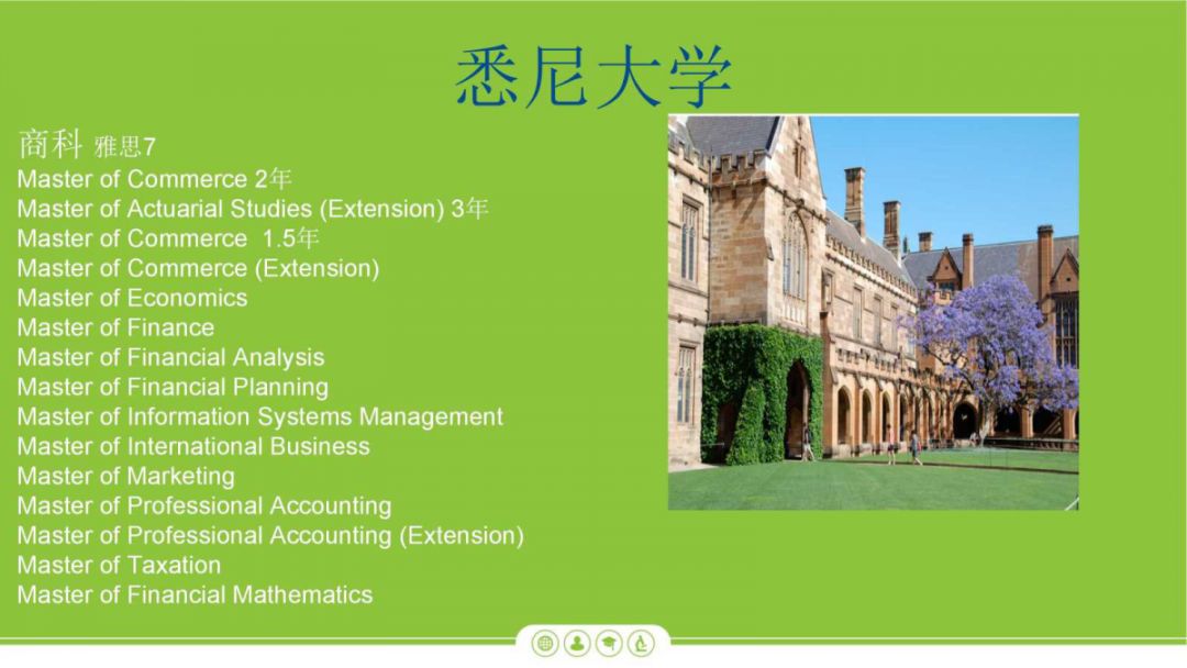 接下来给大家说一下悉尼大学。每年申请悉尼大学的人都非常多。给大家推荐一些商科比较热门的专业,像经济、金融、税法等专业课程。根据个人情况选择专业。这里要强调一下,悉尼大学商科的雅思需要7分!
