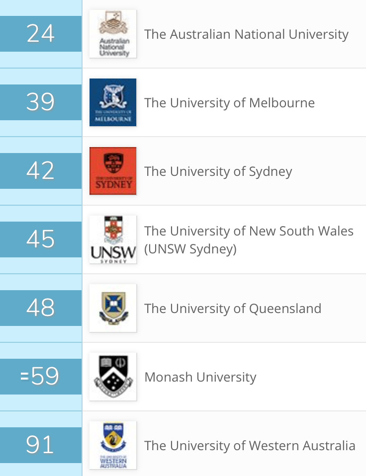 在今年的QS排名中,共有7所澳大利亚高校进入世界top100,其中,澳大利亚国立大学以24名的成绩居澳大利亚各高校榜首,紧随其后的是墨尔本大学(39)、悉尼大学(42)、新南威尔士大学(45)、昆士兰大学(48)、莫纳什大学(59),和西澳大学(91)。