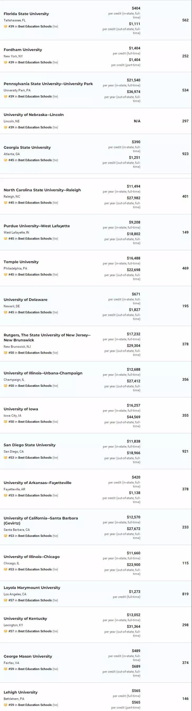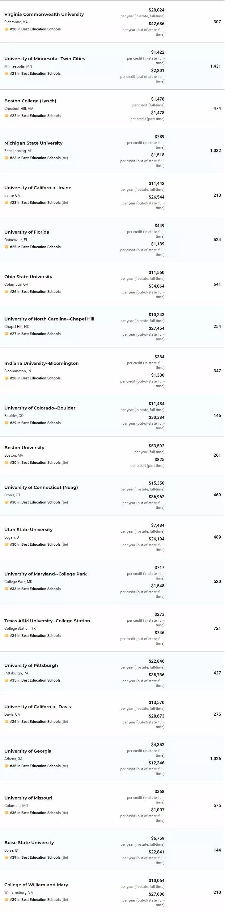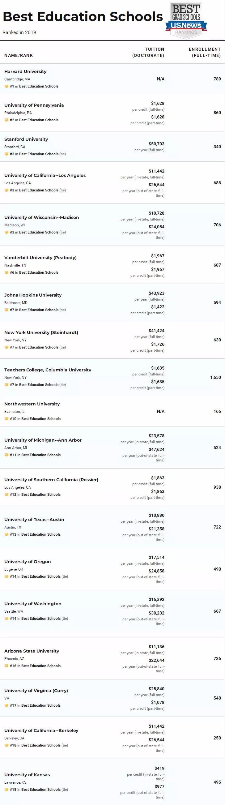 2020年USNew全美最佳研究生教育学院Top50: