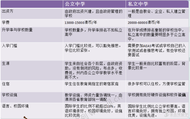 在澳大利亚,目前公立中学占所有中学数量的三分之二,私立中学占三分之一。公立中学的办学资金绝大部分由政府资助,因此澳大利亚的公民和永久居民就读公立中学不需要缴纳学费;私立中学的办学资金大部分靠自筹,因此澳大利亚的公民和永久居民就读私立中学需要缴纳学费。在面向海外学生的收费方面,公立中学的平均学费要大大低于私立中学的平均学费。以 2012年的学费为例,公立中学中学费最贵的是堪培拉公立中学,每年的高中学费为13900澳元,学费最低的是塔斯马尼亚公立中学,每年的高中学费仅为10500澳元;私立中学的平均学费可达到每年25000澳元,学费较高的如凯瑞文法学校(高中每年学费27000澳元)、图拉克中学(高中每年学费26000澳元),崔尼迪文法学校(高中每年学费28000澳元),学费相对较低的如阿得雷德大学附中(高中每年学费18000澳元)。由于私立中学的学费普遍高于公立中学,因此,总体来说,私立中学的平均硬件设施、师资力量等要好于公立中学。需要指出的是,私立中学对海外学生的收费是一个学校一个价格,公立中学的收费则是由澳大利亚的州或地区的政府教育局统一制定的;比如,在悉尼所在的新南威尔士州,目前一共有113所公立中学可以招收海外学生,它们的2012年学费均为13000澳元。因此,学生如果能够申请到教学质量和升学率比较好的公立中学,从性价比角度来说,可能会高于申请到一般的私立中学。