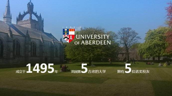 阿伯丁大学(University of Abereen,简称AU)于 1495年在苏格兰阿伯丁创立,是著名的教育和研究中心。该校是中世纪创建的四所苏格兰古大学之一,也是 全英校龄第五长的大学 ,学生总数近 14000名。该大学的教学和研究质量举世闻名,拥有五名诺贝尔奖得主。阿伯丁大学的医学享有盛誉, 设有英语系国家第一所医学院, 该校教授的研究导致曾发现胰岛素和核磁共震。前任港督卫奕信勋爵于 1997年起出任阿伯丁大学校监,而英国前首相温斯顿。丘吉尔亦曾担任此职。阿伯丁大学位于风景怡人的苏格兰东海岸,500年历史的古建筑群仍在使用当中,并早已成为苏格兰的风景名胜。