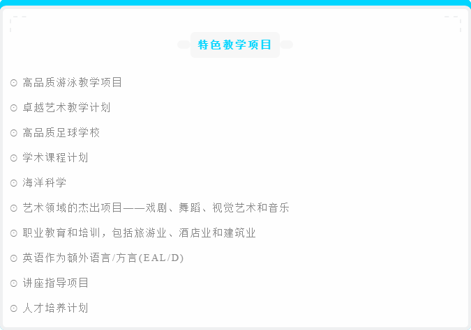 水上运动精英课程 是学 校 教学的一大重点项目。学校拥有优越的水上运动地理条件,拥有奥运级别的皮划艇训练场、综合游泳池和赛艇区,可以提供众多水上项目,如冲浪、水球、皮划艇、救生、风筝冲浪和潜水等。