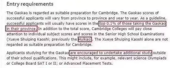 作为这样的一所名校,以前无论如何是不会承认中国的高考成绩的。中国的学生再优秀, 想要上剑桥大学,必须接受他的游戏规划,也就是接受A-level成绩 :A*AA或接受IB成绩:40-42 points,with 776 at Higher Level,符合这两个条件中任何一个可以报考。当然,报考还不一定通过。