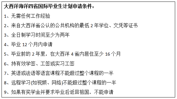 据了解,这个海洋四省的移民政策包括了三大内容:大西洋高技能计划(简称AHSP) 、大西洋中等技能计划(简称AISP) 、大西洋国际毕业生计划(简称AIGP)。其中 AIGP计划无需工作经验,要求申请人取得以上四省公立院校至少2年的高等教育文凭,并且必须在毕业后12个月内申请。而指定雇主的工作offer方面,则要求全职一年以上的合同(属国家职业列表上的0、A、B、C类别)。目前适合国际生申请AIGP类别的学校包括达尔豪斯大学、纽芬兰纪念大学、爱德华王子岛大学、新布伦瑞克大学等。具体申请条件如下: