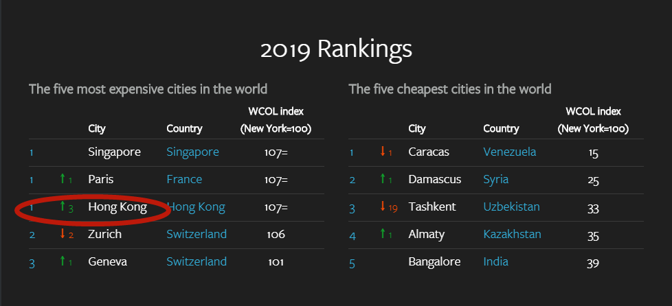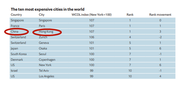 根据《经济学人》公布的最新的《全球生活成本城市榜单》(该报告选取了全球 90 多个国家的 130 多个城市的数据。 全球生活成本调查是经济学人智库每年开展的调查项目,针对93个国家133座城市,对超过160多类产品和服务的400多项价格指标展开调查。研究数据包括: 面包价格、剪头发价格等。 )显示: 在中国生活成本最高的城市是香港。